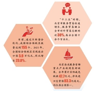 兩年多來,北京“兩區”建設成效突出、亮點紛呈。作為創新示范者,北京海關助力天竺綜保區加快打造具有服務貿易特色的綜合保稅區,為北京開放發展先行先試前沿政策,為我國海關特殊監管區域創新發展探索經驗。2021年度,天竺綜保區進出口值、營業收入、屬地稅收分別同比增長37.6%、25.1%、22.1%,其中藥品藥械、文化藝術品進口規模分別占到全國總量的1/5、1/3。目前,園區形成了醫療健康、文化貿易、升級型消費、航空服務等重點產業。