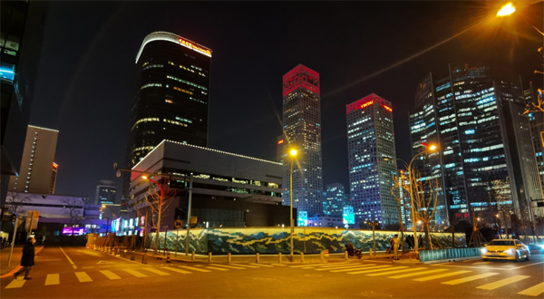 長卷中鑲嵌了中國現有56處世界遺產“金名片”,畫面中的山水意象分別由6種表達天空、山體和長河的塑料模塊通過定制龍骨干掛組合而成。日后若停車場用地進行開發建設或圍墻拆除,塑料模塊磚可取下至別處重新設計安裝,形成匹配新界面的新視覺畫面,以體現全過程可持續環保理念,為CBD這片北京綠色建筑最為集中的區域,再添一抹綠元素。