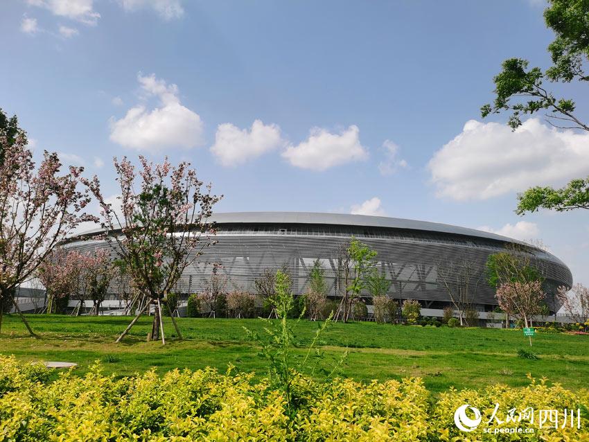 龍泉山脈綿亙遠方,東安湖水蕩漾眼底,體育場館巍峨半空,花草樹木各展春姿。在湖光山色之間,有大量市民前來踏青賞春,順便欣賞著大運會場館和火炬塔的風采。