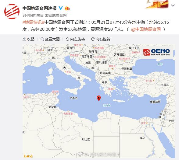 中新網5月21日電 據中國地震臺網正式測定:5月21日7時43分在地中海(北緯35.15度,東經20.30度)發生5.6級地震,震源深度20千米。
