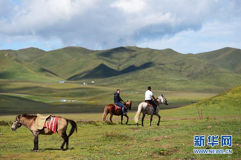 2019年8月13日,游客在甘南藏族自治州碌曲縣尕海鎮尕秀村草原上騎馬。新華社記者 趙丁喆 攝