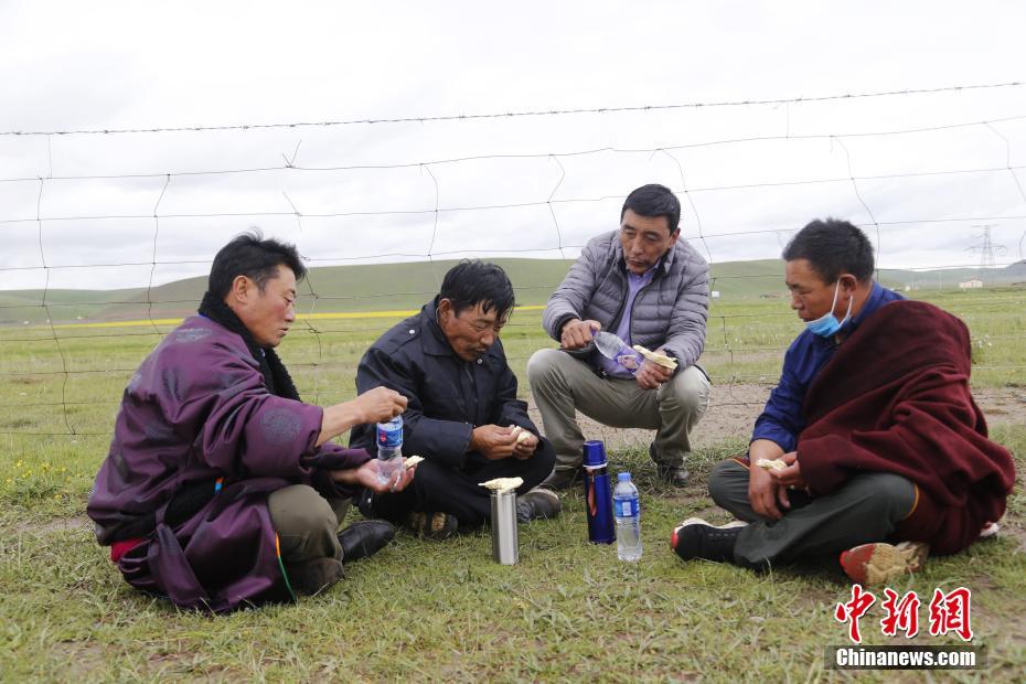 7月21日,青海省海北藏族自治州剛察縣伊克烏蘭鄉剛察貢麻村的索南木旦巴(左一)、仁增才讓(左二)、吉科加(右二)、萬瑪扎西(右一)四人在撿拾著草場垃圾途中,吃餅子,喝礦泉水充饑。2008年,萬瑪扎西路在村支書的支持下,與索南木旦巴、仁增才讓、吉科加三個人組建了義務環保隊,自此一干就是12年。他們在撿拾垃圾的同時進行著環保宣傳,希望從源頭減少垃圾。仁增才讓說:“現在草原上的垃圾幾乎是看不到了。”中新社記者 馬銘言 攝